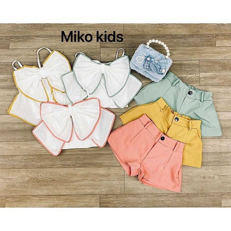 Quần áo bé gái, nguyên set phối áo hai dây nơ cho bé gái đi chơi đẹp từ 12-40kg hàng thiết kế