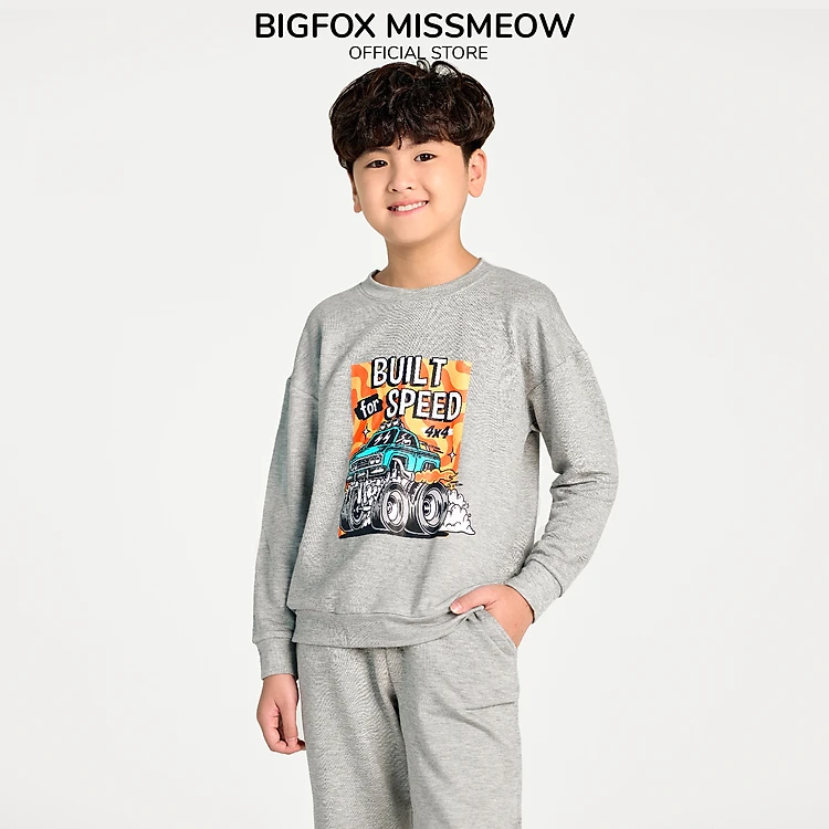 Quần áo bé trai thu đông Bigfox Miss Meow size đại, bộ nỉ cho bé vải nỉ da cá mềm mịn in ô tô size trẻ em 3,4,..11 tuổi