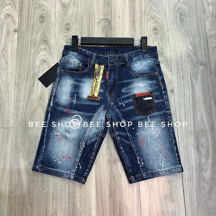 Quần bò ngố nam Dsq vá túi vẩy sơn , quần jean nam, quần short bò khoá lệch - Bee Shop