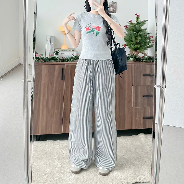 Quần dài kẻ sọc ống rộng có dây rút chất vải thoáng mát Kona Miều Est.2013