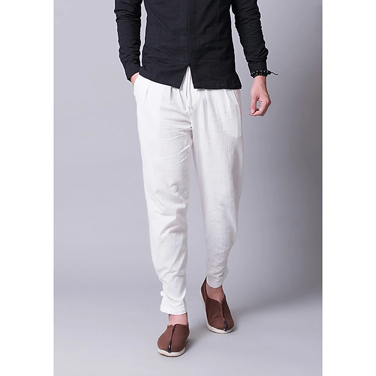 Quần đũi nam ống túm có phần đùi trên tương đối rộng mang lại sự thoải mái nhất định, thêm vào đấy là phần ống quần có thể túm lại nhờ cúc tết, giúp bạn đa dạng trong việc sử dụng quần. Bạn có thể túm quần lại bằng cách cài khuy hoặc bỏ ra rất thoải mái dóng dạng quần ống suông.