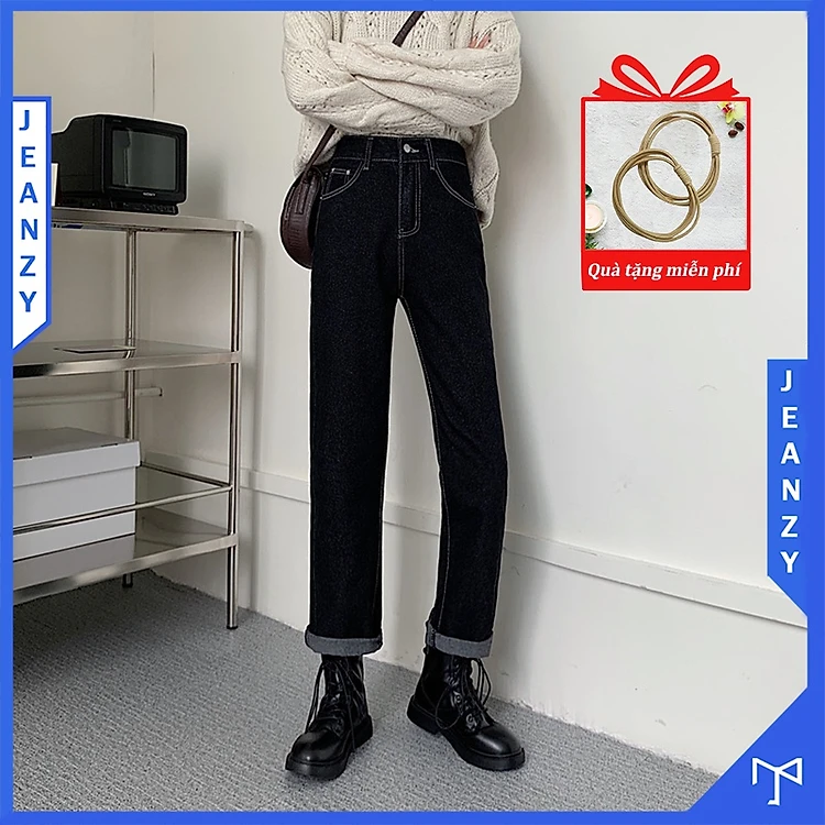 Quần jean chỉ nổi màu xanh tím than kiểu quần jean ống suông hot trend