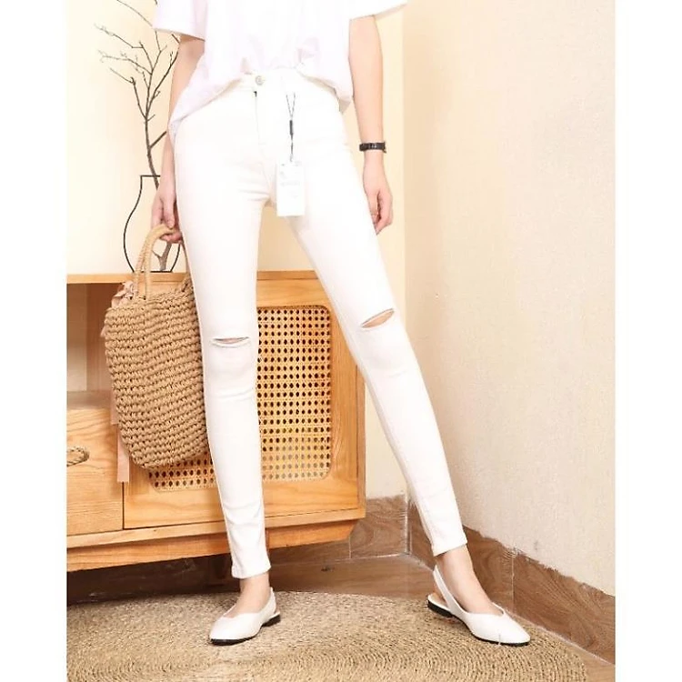 Quần jeans skinny trắng rách ngang gối, quần bò nữ dáng ôm