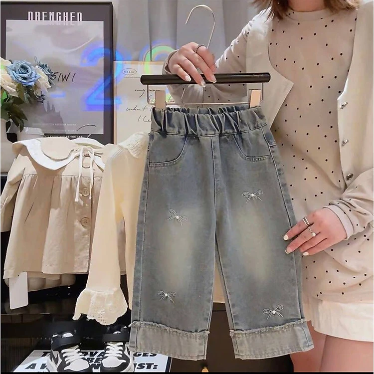 Quần jeans suông bé gái thêu nơ, phối gấu NeSa shop, chất vải mềm, mịn, mát, Quần bò bé gái thời trang từ 12-31kg
