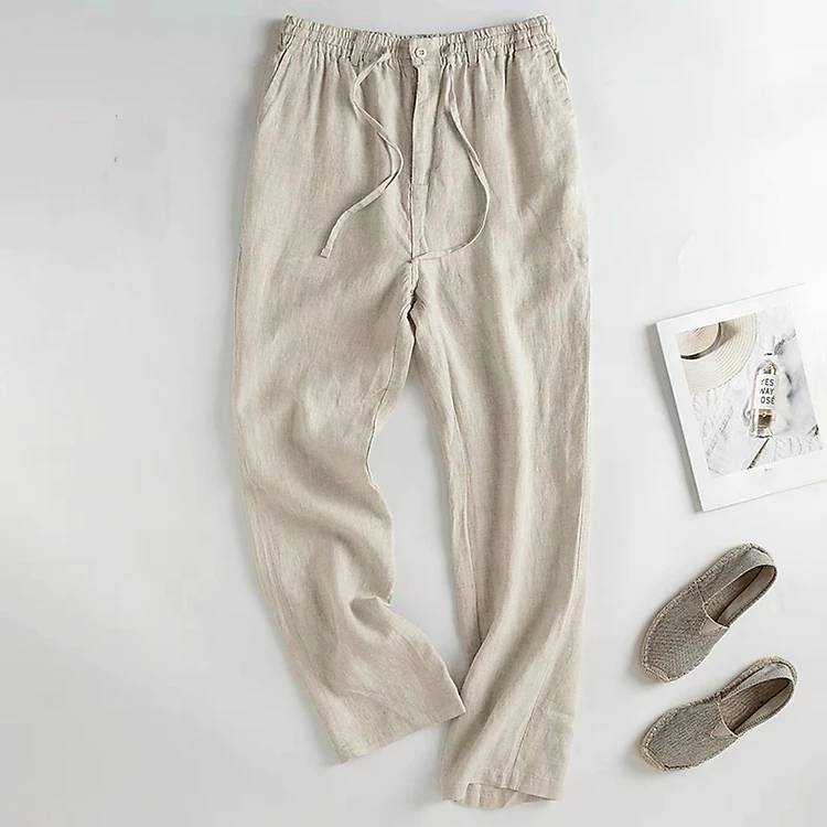 Quần linen nam ống suông, quần dài ống rộng cạp chun có dây rút và khuy trước, phong cách tối giản, vintage Qd11