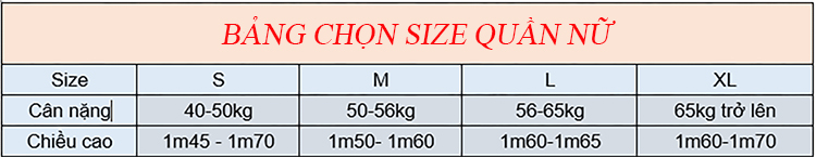Đây là bảng chọn size Quần Lửng Nữ Tập Gym Yoga Lưng Cao (tham khảo) cho bạn: