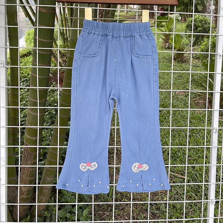 Quần ống loe cho bé gái 1-6 tuổi đính nơ gấu và hoa vải bò giấy mỏng mềm mại thời trang
