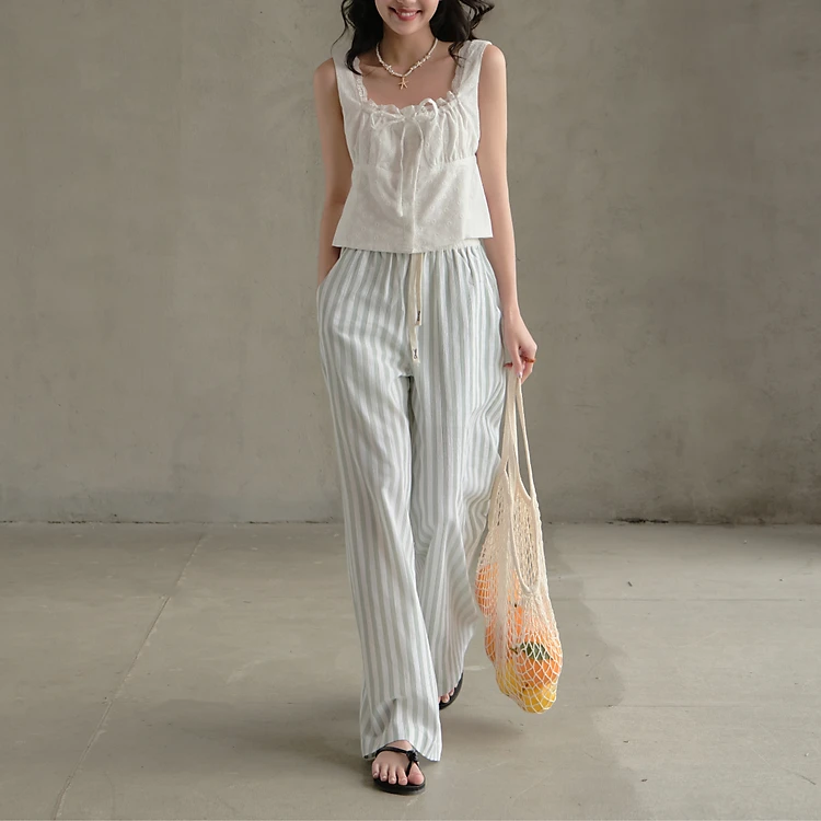 Quần ống rộng kẻ sọc nữ dễ phối đồ thích hợp đi biển Kony Miều Est.2013