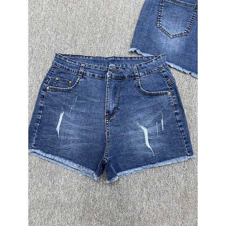 Quần short jean nữ BigSize lưng cao trên rốn, co dãn mạnh, tua lai, màu xanh đậm rách kiểu dành cho người mập 2717