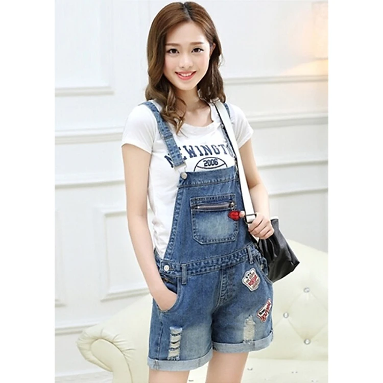 Quần Yếm Jean Short Nữ Wash Rách Thêu Logo