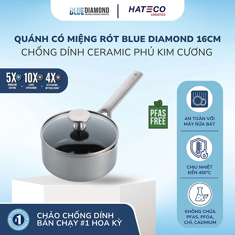 Quánh chống dính có miệng rót thép không gỉ phủ tinh thể kim cương cao cấp Blue Diamond 16cm có nắp kính