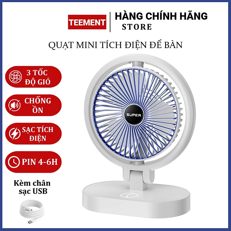 Quạt Để Bàn Tích Điện Mini Cao Cấp Teement, Tích Hợp Đèn Ngủ Động Cơ Không Tiếng Ồn Pin 1200mah , Điều Chỉnh Lên Xuống 360°, 3 Cấp Độ Gió Siêu Mát Dễ Điều Chỉnh- Hàng Chính Hãng
