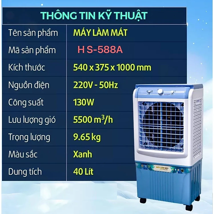 Quạt điều hòa hơi nước HS-588A, dung tích 45l, tặng 2 đá khô