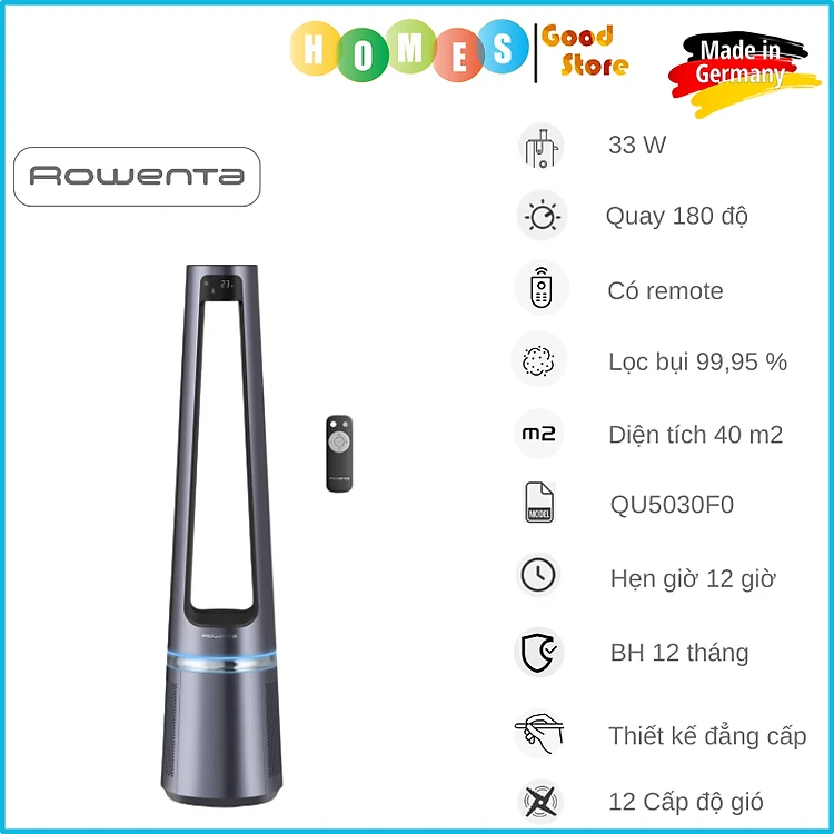 Quạt Không Cánh, Kiêm Lọc Không Khí ROWENTA ECLIPSE QU5030F0 12 Cấp Độ Gió, Lọc Sạch 99,95% Bụi Mịn, Cảm Biến Nhiệt Độ Auto, Ồn Cực Thấp, Công Suất 33 W - Hàng Nhập Khẩu Đức