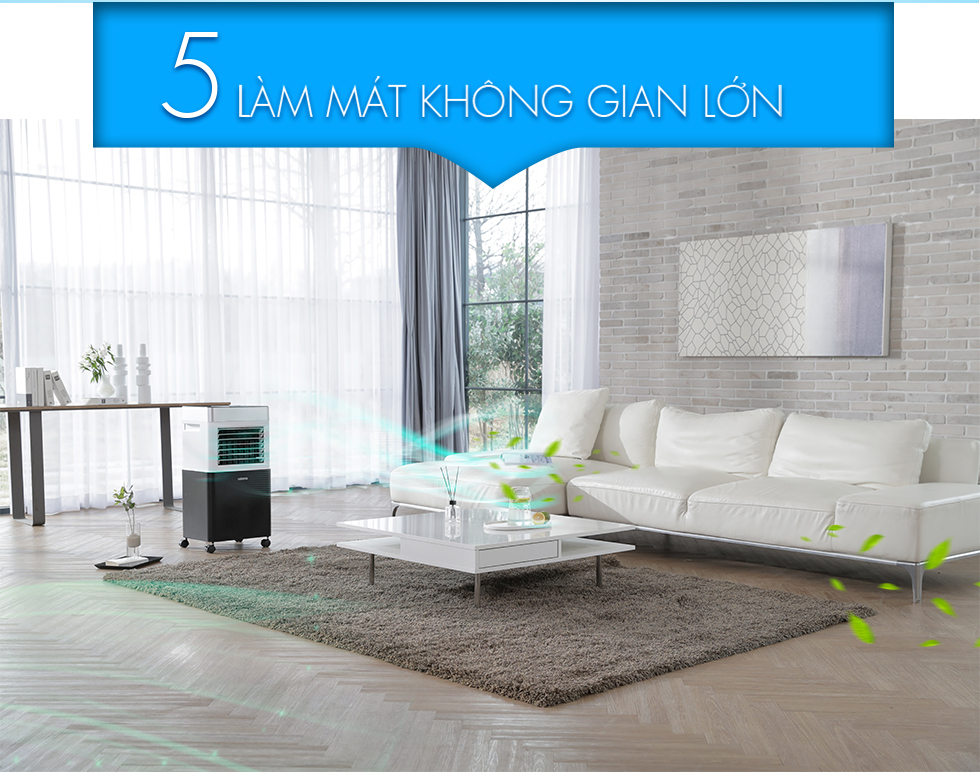 Làm mát được không gian lớn: quạt có chiều cao 1m, bề mặt tản gió rộng 0.5m, công suất và dung tích bình nước lớn, tạo ra làn gió mạnh mát lạnh cả phòng lớn.