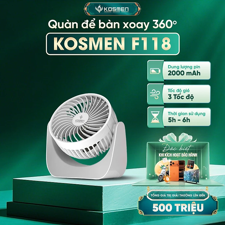 Quạt Mini Để Bàn Kosmen F118 Có Lưới Bảo Vệ , Dung Lượng Pin Khủng, Xoay 360 Độ - Hàng Chính Hãng