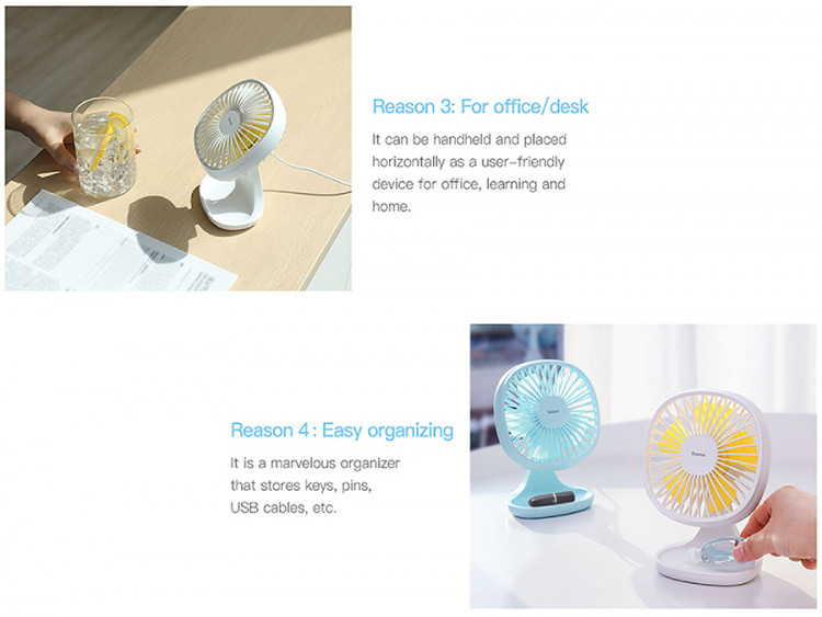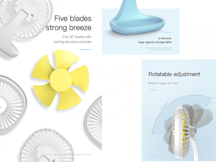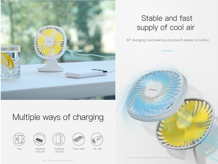 Quạt mini để bàn Baseus có sức gió mạnh vừa và tự nhiên nhờ cơ cấu cánh quạt và bộ khung bảo vệ có thiết kế thông minh có tác dụng khuếch tán luồng gió, cho cảm giác tự nhiên và thoải mái hơn khi sử dụng.