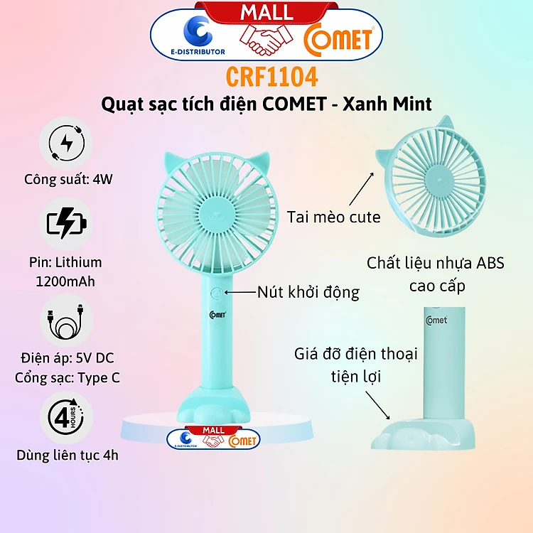 Quạt Sạc Tích Điện Cầm Tay Comet CRF1104 - Công Suất 4W - Dùng Liên Tục 4H - Hàng Chính Hãng - Bảo Hành 12 Tháng