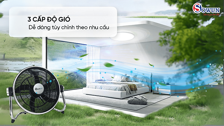 Trang bị 3 mức gió từ nhẹ đến mạnh, Quạt sàn công nghiệp turbo SOWUN 5 cánh SW 810 có thể đáp ứng tốt nhu cầu làm mát theo thời điểm trong ngày hoặc điều kiện thời tiết. Người dùng có thể thao tác tùy chỉnh nhanh chóng qua núm vặn, dễ dàng sử dụng cho cả người lớn tuổi hoặc trẻ nhỏ.