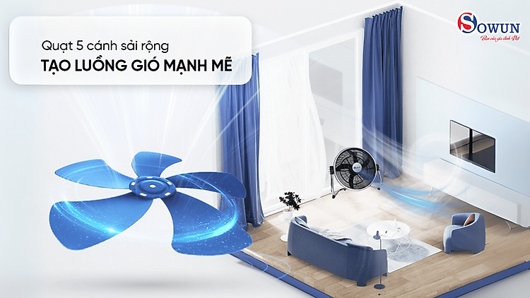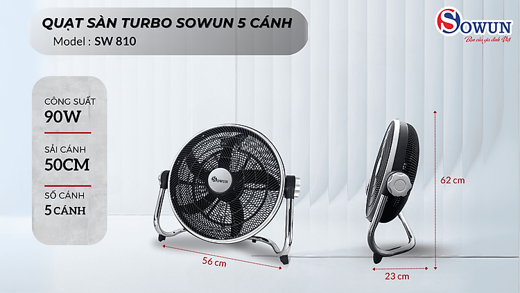 Quạt sàn công nghiệp turbo SOWUN 5 cánh SW 810 mang đến luồng gió mạnh mẽ lan tỏa rộng khắp không gian, giúp bạn tận hưởng làn gió mát mẻ và sảng khoái tức thì.