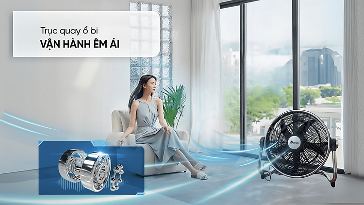 Quạt sử dụng động cơ đồng kết hợp trục quay dạng ổ bi, giúp vận hành ổn định, giảm ma sát và hạn chế tiếng ồn tối đa. Thiết kế này không chỉ nâng cao độ bền mà còn cho phép sử dụng liên tục nhiều giờ liền mà không lo nóng máy hay rung lắc, mang lại trải nghiệm thoải mái trong mọi thời điểm.