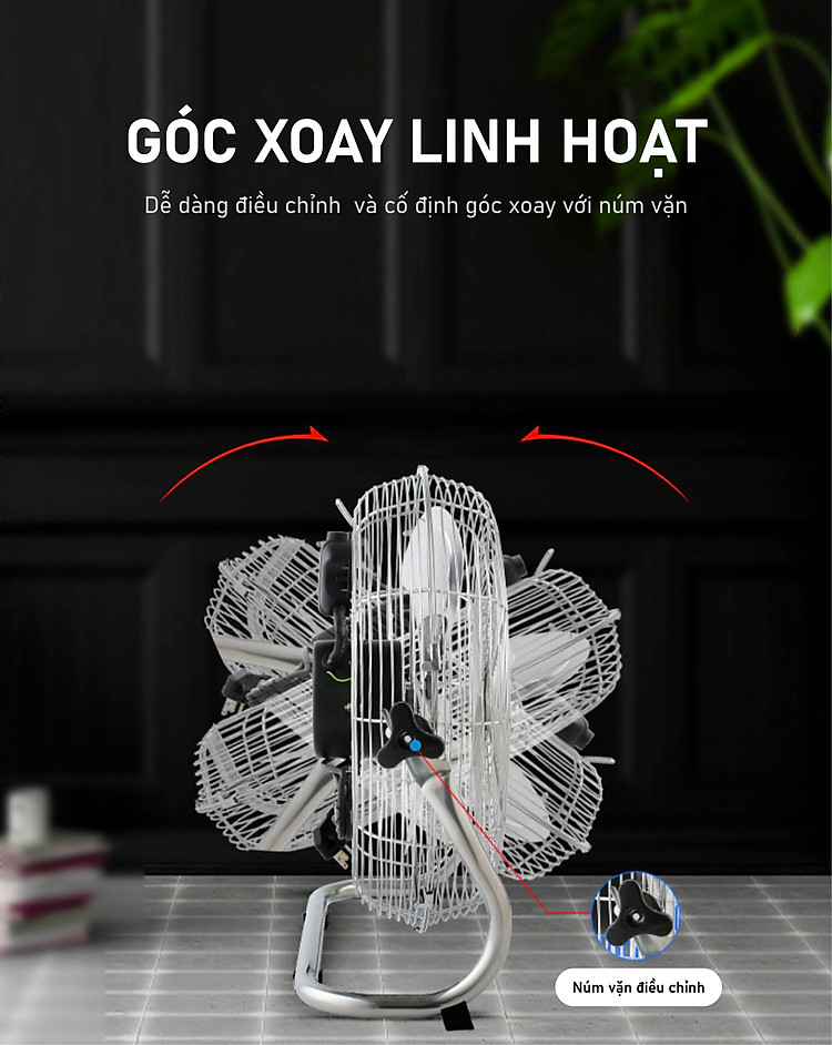 • Với núm vặn tiện lợi, bạn có thể dễ dàng điều chỉnh góc xoay của quạt một cách linh hoạt, phù hợp với mọi nhu cầu sử dụng trong mọi trường hợp.