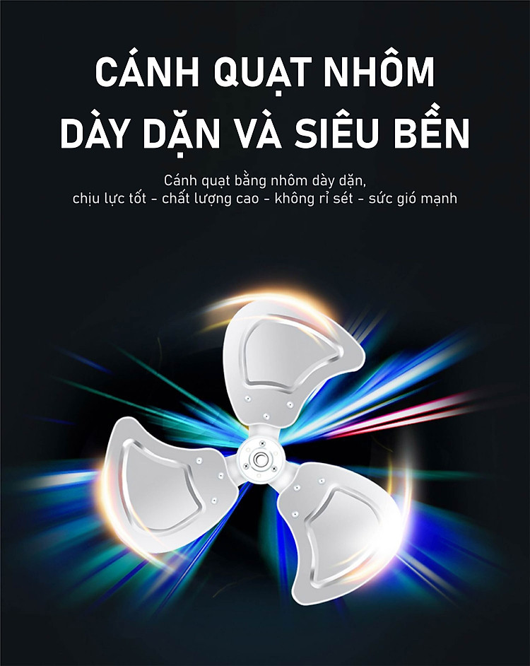 • Khác với các thiết bị quạt công nghiệp có cánh bằng nhựa, dễ bị hư gãy do tác động từ bên ngoài.  có cánh bằng nhôm bền, nhẹ, chắc chắn, khó bị hư hỏng do tác động mạnh từ bên ngoài. Bên cạnh đó, do thiết kế cánh quạt 3 cánh 12 inch làm giảm lực ma sát của không khí, quạt sẽ hoạt động hiệu quả hơn, năng suất hơn và giúp tiết kiệm điện năng. Điều này hoàn toàn phù hợp với nhu cầu sử dụng của mọi người, mọi nhà và những nơi có không gian mở.