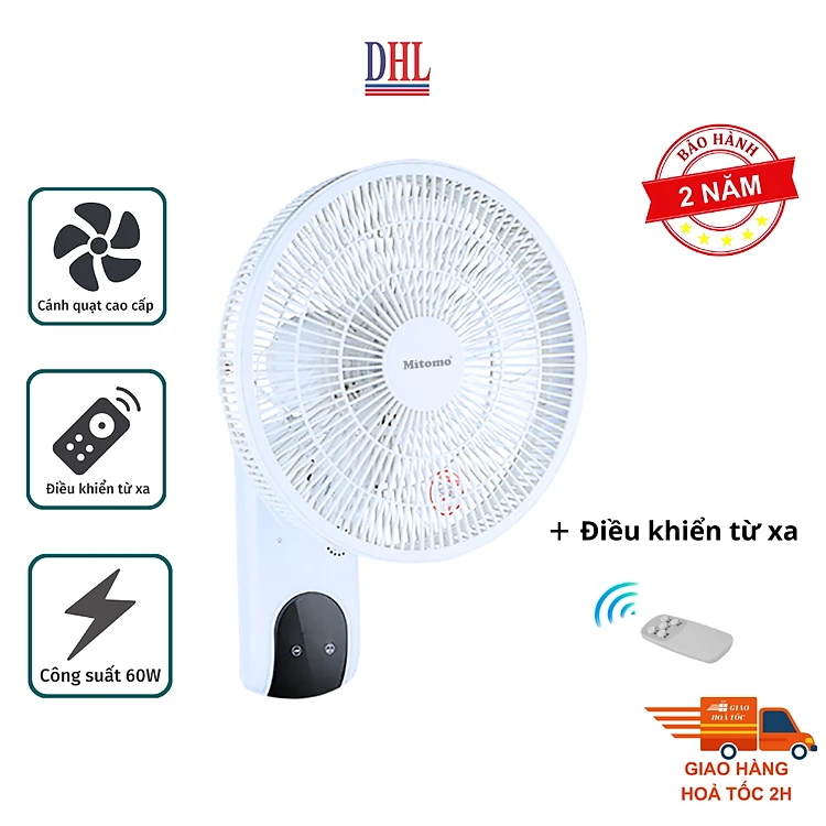 Quạt treo tường điện tử Mitomo FTT-60HE, sử dụng bạc đạn hoạt động siêu êm, công suất 60W mạnh mẽ - Hàng chính hãng