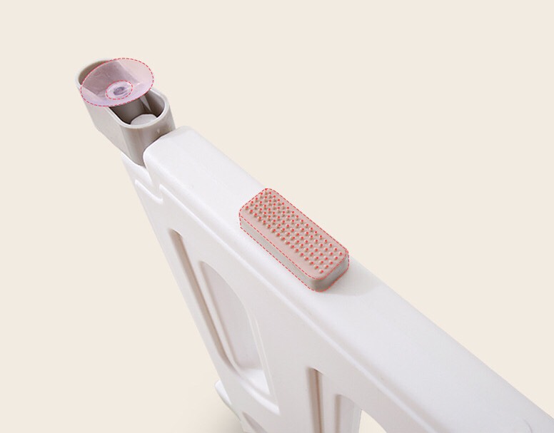 Mặt chân đế có đồng thời hai "khóa chống trượt": miếng cao su nhám và nút hít chân không, giúp quây cũi hút chặt vào sàn nhà