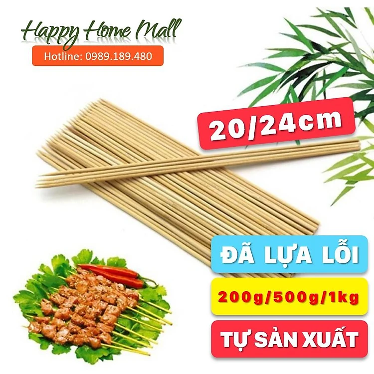 Que xiên thịt nướng, thịt rán, hoa quả, xúc xích bằng tre