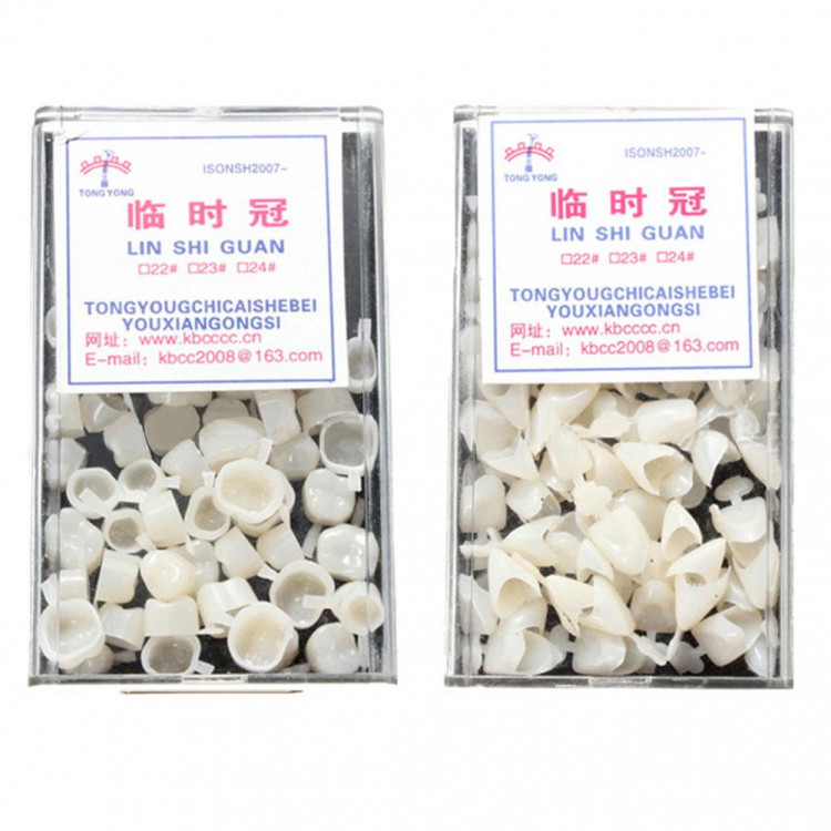 Usage: After selecting the suitable crown, put the resin into the crown, immediately cover the prepared abutment teeth, change the shape, size, neck edge of the cured temporary crown and Bridge grinding to fit, polish and cement with Z0E cement.