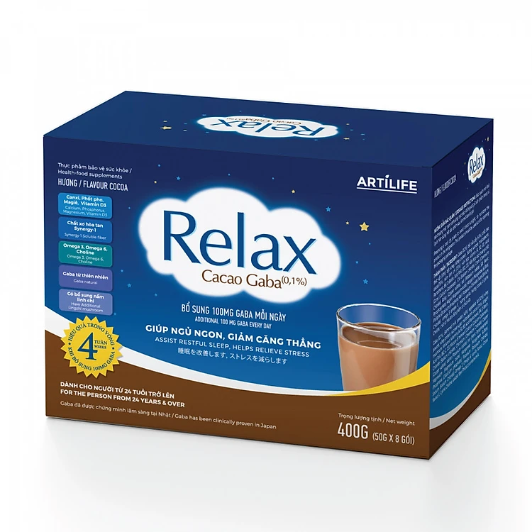 Relax Cacao Gaba thay thế bữa ăn phụ, bổ sung Nấm linh chi, protein, vitamin và khoáng chất… Relax Cacao Gaba chứa Gaba là thành phần chính tạo nên công dụng của sản phẩm, đã được các nhà khoa học ở Nhật Bản nghiên cứu lâm sàng với liều dùng 100mg, Gaba cho hiệu quả trong vòng 4 tuần giúp ngủ ngon, giảm căng thẳng.
