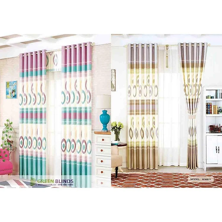 Rèm cửa sổ cửa chính gấm hoa văn hai mặt hai màu khác nhau - họa tiết hình tròn đan xen màu hồng xanh và vàng