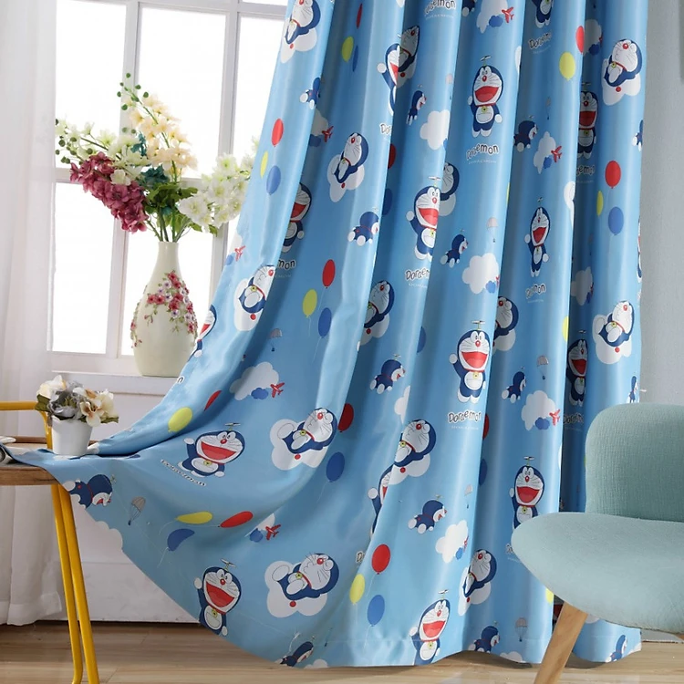 • Rèm vải in họa tiết đô rê mon, chất liệu vải sợi dày, tạo không gian và phong cách sang trọng.