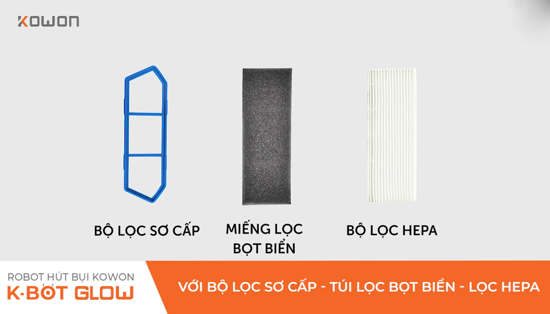 Khác với nhiều sản phẩm robot hút bụi khác chỉ có 1 hoặc 2 lớp lọc, K-bot Glow gây ấn tượng với bộ lọc gồm 3 lớp theo thứ tự lần lượt: Lọc sơ cấp - Túi lọc bọt biển - Lưới lọc HEPA. Kết cấu thông minh này giúp cho sản phẩm robot hút bụi của Kowon sở hữu khả năng lọc không khí cực sạch.