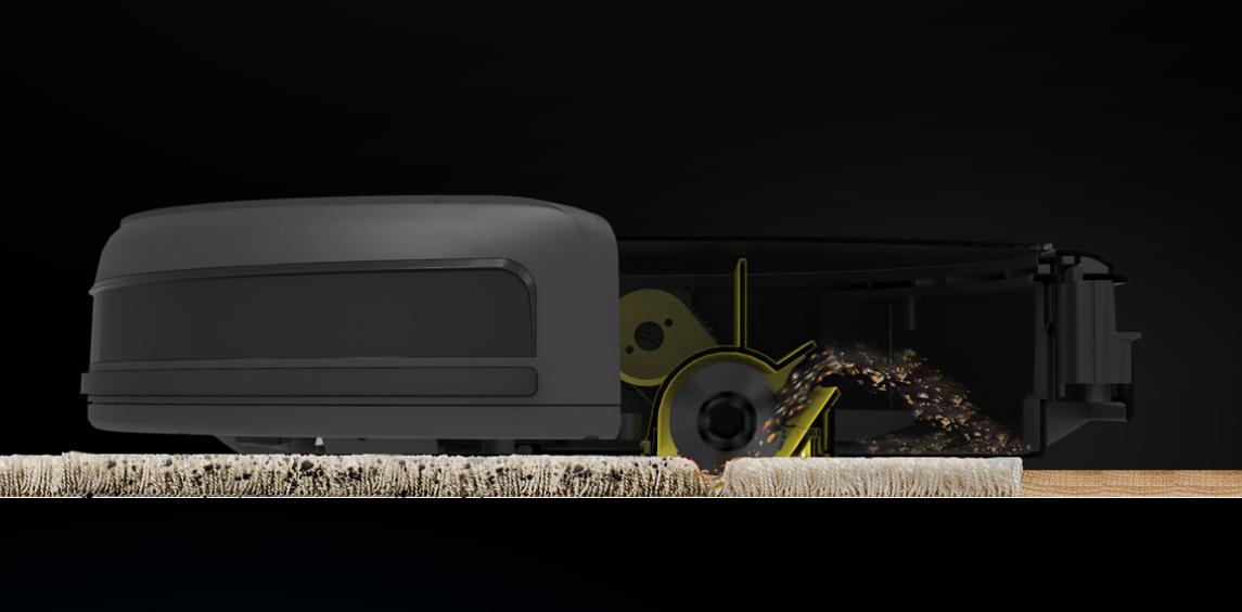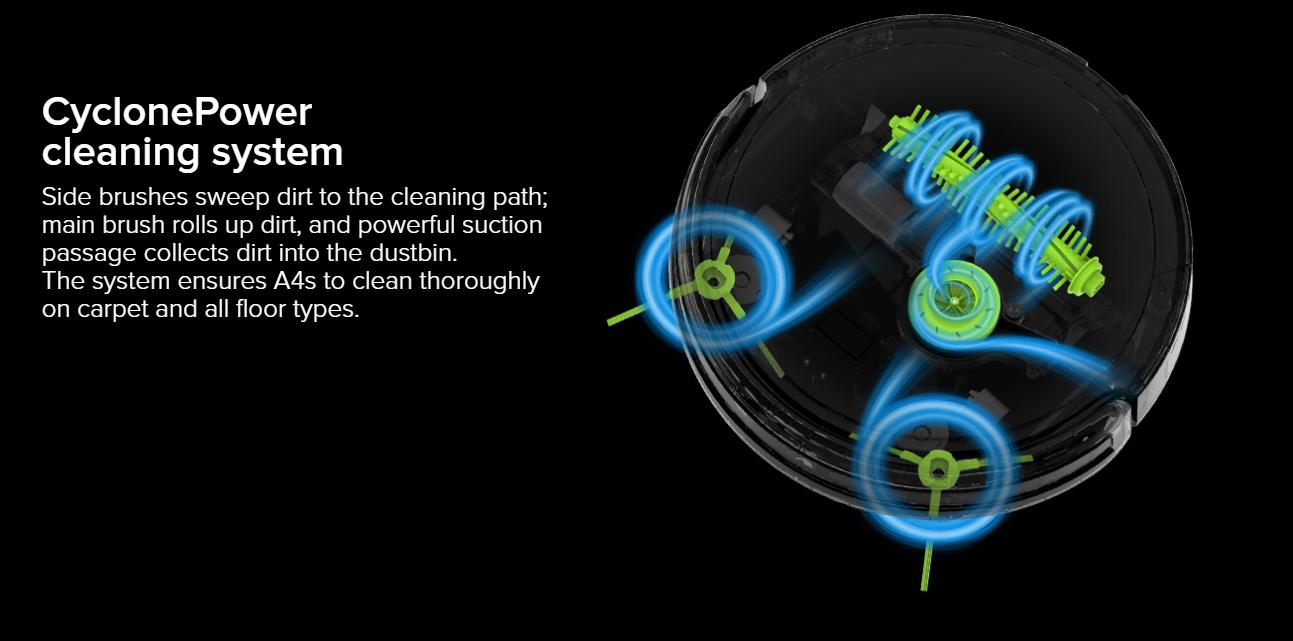 Hai bàn chải 2 bên gom rác, bụi lại và bàn chải chính hút đưa rác bụi tới hộp chứa bằng lực hút cực mạnh. Với hệ thống này, Robot A4s không chỉ tối ưu sức mạnh với thảm mà nó còn thích hợp với nhiều loại sàn khác nhau.