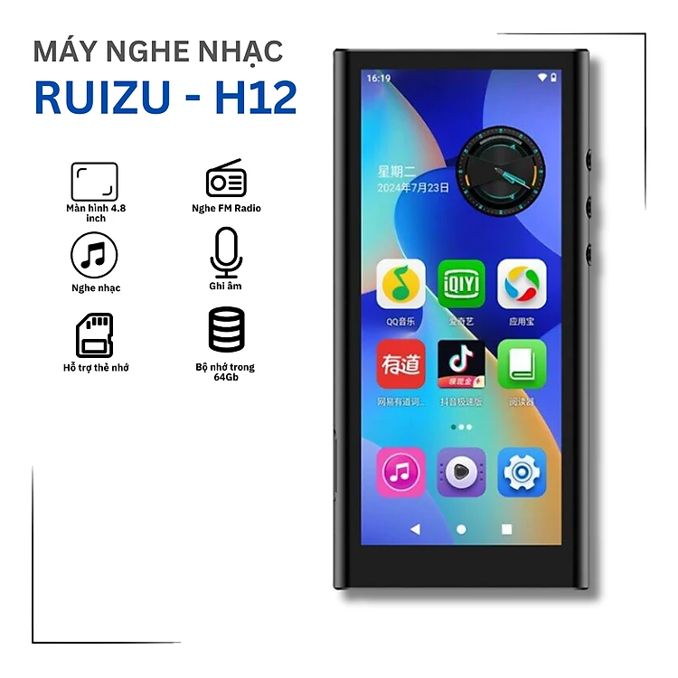 Ruizu H12 Máy Nghe Nhạc Android 10 4.8" IPS Full HD, RAM 4GB, ROM 64GB, Bluetooth 4.2 WiFi băng tần kép, Jack HiFi 3.5mm, Pin 2200mAh Tải App dễ dàng, đọc sách E-book, phát video 1080P, hỗ trợ thẻ TF 128GB Sạc nhanh Type-C - Hàng nhập khẩu