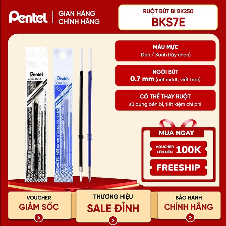 Ruột bút bi Pentel BK250 - BKS7E ngòi 0.7mm (mưc xanh và đen)