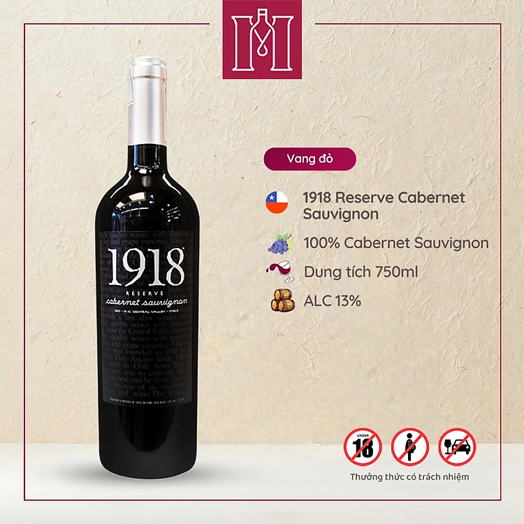 Rượu vang đỏ Chile 1918 Reserve Cabernet Sauvignon 750ml 14.5% - Hàng chính hãng