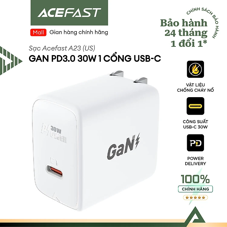 Sạc Acefast GaN PD3.0 30W 1 cổng USB-C (US) - A23 Hàng chính hãng Acefast