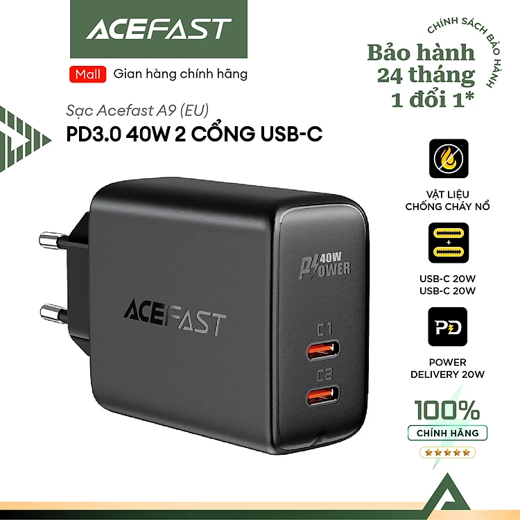 Sạc Acefast PD3.0 40W 2 cổng USB-C (EU) - A9 Hàng chính hãng Acefast