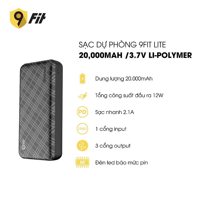 Sạc dự phòng 9FIT Lite 20,000mAh /3.7V Li-Polymer - 9PL20K03B, hỗ trợ sạc nhanh - Hàng chính hãng
