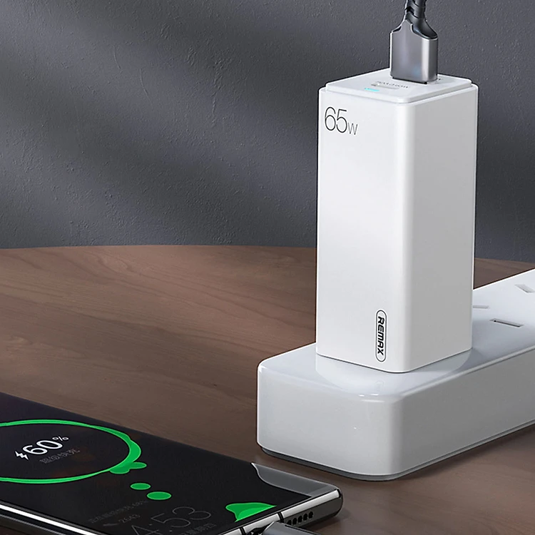 sạc nhanh. Một trong số đó là Remax với sản phẩm củ sạc nhanh 2 cổng Remax 65W GaN. Một củ 2