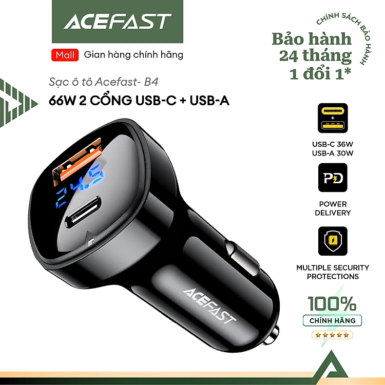 Sạc ô tô Acefast 66W 2 cổng USB-C + USB-A - B4 Hàng chính hãng Acefast