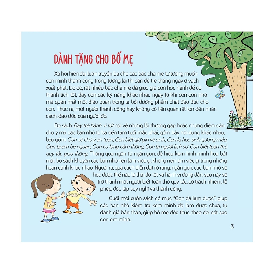 Bồi dưỡng đạo đức cho trẻ nhỏ ngay từ những năm tháng đầu đời là điều vô cùng quan trọng, liên quan rất lớn đến sự thành công của trẻ trong tương lai. Bời lẽ, một con người vừa có tài vừa có đức thì bao giờ cũng sẽ nhận được nhiều sự tôn trọng và yêu mến. Thấu hiểu điều này, bộ sách Dạy trẻ hành vi tốt đã được xuất bản nhằm hỗ trợ các bậc phụ huynh trong quá trình giáo dục đạo đức cho con trẻ.