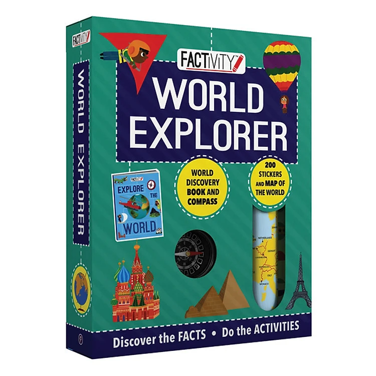 Get ready for adventure with Factivity World Explorer! Take a trip around the amazing wonders of our world with incredible maps, exciting facts, activities and puzzles! Learn how to use a compass and position yourself in relation to the rest of the world. Fill the large map of the world activity poster with famous landmark stickers, country flags, as well as stickering the places you have travelled or would like to visit.