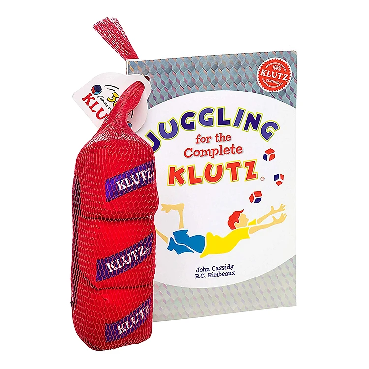 The 35+-year-old flagship title that gave our company its name, Juggling for the Complete Klutz takes readers from the absolute beginning (Step One: The Drop) all the way to Five-Object Juggling. The instructions are friendly, humorous, and so understandable that they set the standard for anyone-can-do-it clarity. This is the book that launched the company, Comes with three juggling cubes, upholstered in plush red velour that makes every catch a pleasure. Comes with: 88 page book, 3 aerodynamically sound bean bags, a storage bag.