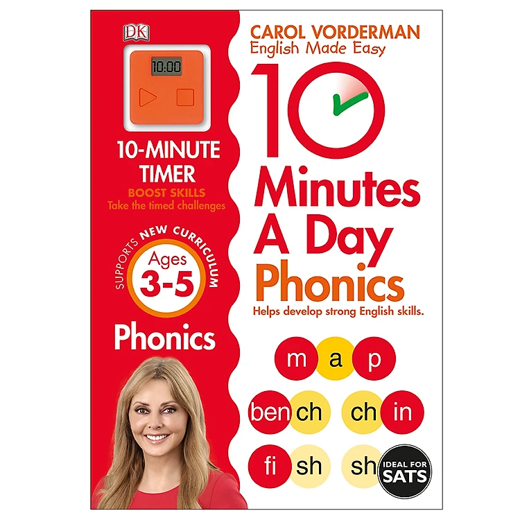 Carol Vorderman's 10 Minutes A Day 10 Phonics for Ages 3-5 includes activities on consonants, short vowel sounds, digraphs, and building words.