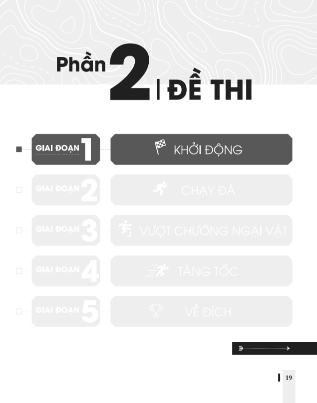 Cuốn sách có tổng cộng 25 đề thi, được chia làm 3 phần, tương ứng với lộ trình 3 giai đoạn ôn thi THPT Quốc gia: Khởi động, chạy đà và vượt chướng ngại vật