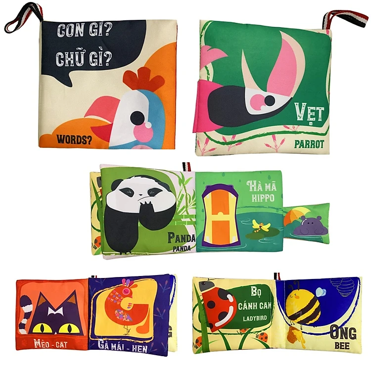 - Đặc biệt bộ sách vải song ngữ sẽ giúp bé thích thú và tăng khả năng nhận thức về vốn từ ngữ cơ bản.